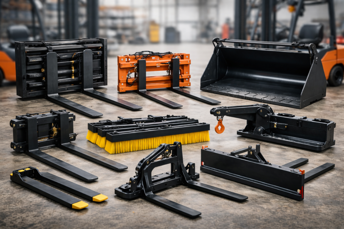 Ponadto posiadamy różnego rodzaju osprzęt niezbędny do funkcjonowania wózków: widły, przedłużki, przesuwy boczne, pozycjonery oraz szereg innych niezbędnych narzędzi.